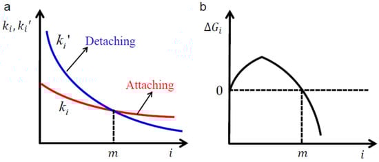 Microscopic kinetics of attaching and detaching for flexible polymer chains. (a) Variation of the rate constants of attaching and detaching with a number of monomers; (b) free energy change of formation of nuclei containing a different number of monomers. The symbol m indicates the number of monomers within the minimum stable nuclei for crystals of flexible polymers.