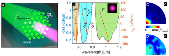 (a) Sketch of the CS2- photonic bandgap fiber (PBGF) (green: hexagonal array of high-index CS2 strands with diameter Dstrand = 1.44 μm and pitch Λ = 3.6 μm; semitransparent dark green: silica; pink: light emitted from the silica core); (b) measured loss spectrum of the fundamental mode (filled areas with green, cyan and yellow colors, left axis) and the corresponding simulated group velocity dispersion (GVD) parameter β2 (orange, right axis). The orange dots indicate three zero dispersion wavelengths (ZDWs). The two grey dashed vertical lines indicate the calculated resonance wavelengths from Equation (1) with m = 2 and 3. The black dotted line indicates the bandgap edge (−5 dB) at 715 nm of the second order PBG. The inset in (b) is the output beam profile captured by the CCD camera (image extension 265 µm: 50 pixels with each pixel size 5.3 µm). The mode field patterns shown in (c,d) refer to the simulated mode profiles inside a selected transmission band ((c) λ = 700 nm, purple square in (b) labeled C) and inside a resonance region ((d) λ = 800 nm, green square in (b) labeled D).