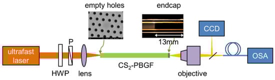 The experimental setup used for the nonlinear experiments is shown in Figure 2. Here, a wavelength-tunable Ti:Sapphire laser system (Chameleon-VIS laser, Coherent, Santa Clara, CA, USA, repetition rate 80 MHz, pulse duration 100 fs) acted as an excitation laser allowing for adjusting the central pump wavelength between 695 nm < λP < 710 nm and thus enabling the investigation of the SCG process as a function of spectral distance between the pump and bandgap edge of PBG Δλ = λe − λP. Note that even though the tuning range of the laser is starting at 690 nm, the laser does not stably operates at this wavelength, thus the investigation starts at 695 nm. Via a combination of a thin-film polarizer and a half-wave plate inserted after the polarized pump laser, the input power launched into the fiber was controlled. The beam was coupled into the core area of the CS2-PBGF (length 0.5 m) using an anti-reflection coated lens (A375-B, Thorlabs, Newton, NJ, USA, focal length 7.5 cm, NA 0.3). A transmission efficiency of 40% (ratio of average output power from the objective and input power before the lens) was achieved. This value was kept constant for different pump wavelengths by slightly adjusting the position of the input lens. The output beam from the fiber was collimated by a 10× objective and guided by a multimode fiber to the spectrometer (AQ-6315A, Ando Electric, Kanagawa, Japan). To monitor the pattern of the mode, a small fraction of the beam was reflected by a wedge and monitored by a CCD camera (Thorlabs, Newton, NJ, USA).