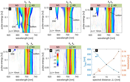 In our previous numerical simulation work [30], we revealed that the spectral distance between our pump and resonance plays a crucial role in the SCG process of PBGF. In the present work, this impact is studied from the experimental perspective. Figure 3a–e show the nonlinear dynamics of SCG process with an increasing pulse energy for different spectral distances Δλ = λe − λp between the pump λp and the bandgap edge λe of second order PBG. The spectral distance Δλ has important influence on the formation of a DW, which is emitted in the normal dispersion (ND) regime by a soliton that is formed from the input pulse after initial self-phase modulation (SPM). When Δλ is decreased from 20 to 10 nm (Figure 3a–d), the generated DW blue shifts (spectral distance between the pump and DW (ΔλDW = λp – λDW) increases). This is accompanied by a higher threshold for DW generation (Figure 3f), which is associated with the increasing spectral distance between soliton and DW [31]. For the case Δλ = 5 nm, the pump energy is not high enough to generate DW radiation. These experimental results can be supported by simulations of nonlinear pulse propagation based on the generalized nonlinear Schrödinger equation (GNLSE) [32] (see Appendix A Figure A2 for details).