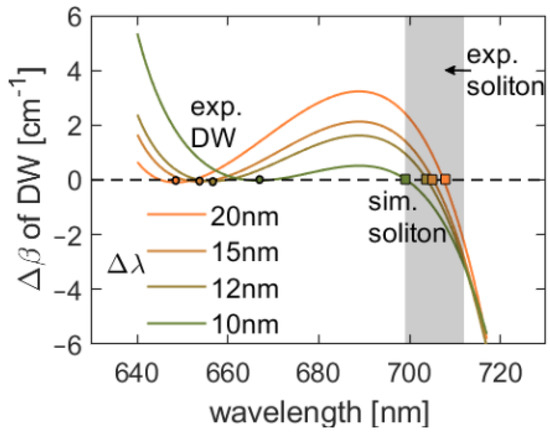Here, ω and ωsol are the frequencies of DW and soliton, respectively, β1,sol = ∂β/∂ω|ωsol is the inverse group velocity at ωsol, Psol is the peak power of the assumed first soliton (with input peak power P0 and soliton number N, Psol = (2 − 1/N)2 × P0) [31], and γ = ωsol × n2/c/Aeff is the nonlinear coefficient (Aeff is the effective mode area and n2 is the nonlinear refractive index). The condition ΔβDW = 0 determines the phase-matched spectral location of DW (λDW) in the case the soliton wavelength (λsol) is given or vice versa. Note that in the experiments the observed λsol is located in close proximity to or inside the resonant (high-loss) region and thus this wavelength cannot be unambiguously determined, whilst λDW is clearly visible in the energy/spectral evolutions (Figure 3a–d). Therefore, the λsol is calculated from the measured spectral position and the threshold of DW (taken from its creation position, 667 nm at 0.04 nJ, 657 nm at 0.08 nJ, 654 nm at 0.11 nJ, and 649 nm at 0.15 nJ corresponding to Figure 3a–d, respectively) via Equation (2) and is shown in Figure 4. It can be seen that the solitons are located between 704 nm < λ < 713 nm (marked as gray bar in Figure 4) for the cases of Δλ = 20, 15, 12 and 10 nm, which agrees well with the experimental results in Figure 3a–e. It should be noted that in the dispersion simulation, a small deviation in the hole diameter (2%) will cause a 10 nm deviation of ZDW and thus induce a significant discrepancy from the experimental results (see Appendix A Figure A3 and Table A1 for details). While such structural asymmetries may only have a minor effect on the transmission spectra of anti-resonant reflecting optical waveguide (ARROW) PCFs, it is quite likely that they greatly affect the higher-order dispersion terms that are important for ultrafast nonlinear frequency conversion.