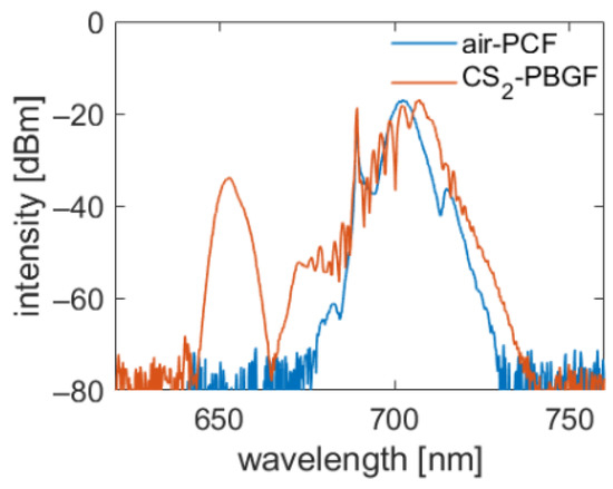 To clearly demonstrate that filling the PCF with CS2 leads to a massive change of waveguide dispersion and thus to the nonlinear frequency conversion, Figure 5 shows the measured output spectra of the CS2-PBGF (blue) in comparison to the same PCF with air holes (orange) both at the same pump peak power (1.5 kW) and pump wavelength (λp = 700 nm). For the empty PCF, only SPM in close proximity to λp can be observed, whilst efficient DW generation is visible for the CS2-PBGF due to the entirely different dispersion landscape. Note that the ZDW of the air-hole based PCF is ~1400 nm, which is an unsuitable scenario for DW generation pumped at around 700 nm. The CS2-PBGF, however, shows a ZDW at 689 nm which is induced by the inclusion of the resonance and enables DW formation. The sharp spectral peak at around 690 nm which can be seen in Figure 3a–e and Figure 5 is a feature of the pump laser.