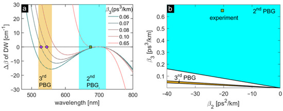 (a) Analytical description of the phase-mismatching rate ΔβDW as a function of β3 in the second order PBG with β2 = −20.4 ps2/km corresponding to Δλ = 20 nm case. The solid lines indicate ΔβDW neglecting the nonlinear phase (Equation (3)) while the dashed lines indicate ΔβDW with the nonlinear phase (Equation (2), γ = 6.5 W−1/km, N = 1.6, Psol = 1 kW corresponding to DW generation threshold in Figure 3b). The cyan bar indicates the second order PBG and the yellow bar indicates the third order PBG of the sample. The green square corresponds to the Δλ = 20 nm case in Figure 3b. The purple dots indicate the DW generated across the resonance band; (b) the estimated DW wavelength for different combinations of β2 and β3 from Equation (4) (soliton wavelength λsol = 699 nm corresponding to the Δλ = 20 nm case). The cyan area indicates the second order PBG and the yellow area indicates third order PBG of the sample. The green square indicates the generated DW in the experiment for the Δλ = 20 nm case.
