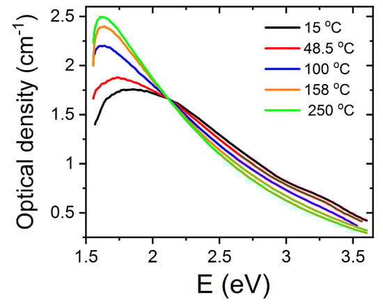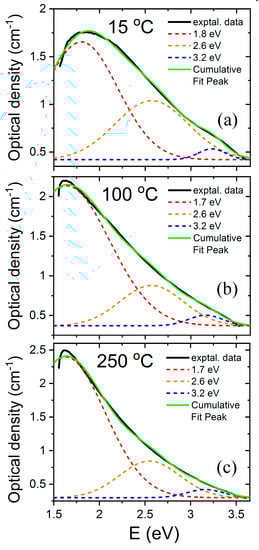 Absorption spectra and Gaussian decomposition obtained for congruent LiNbO3 irradiated with high-energy electrons at various temperatures (a) 15 °C, (b) 100 °C, (c) 250 °C. This figure has been adapted from Hodgson et al. [32], Copyright (1987), with permission from Elsevier.