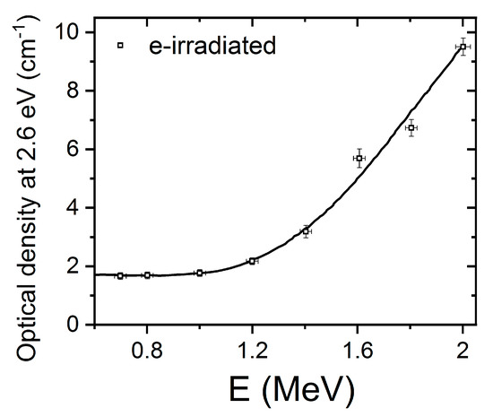 LiNbO3 is a reference inorganic material for nonlinear optical applications, particularly in relation to charge transport (photorefractive) nonlinearities. The experiments to be discussed here involve the measurement of the optical absorption spectra induced by high-energy electron irradiation up to 2 MeV on congruent samples [32]. In these pioneer experiments, a sample is sandwiched inside a small double oven situated in a vacuum irradiation chamber, which allows for enabling in situ measurement of the optical absorption spectrum in real time. For low-electron energies, a low intensity, broad, and structureless absorption spectrum is produced. However, for higher energies (>0.3 MeV), a more well-defined absorption spectrum develops with a broad peak at about 2.6 eV (480 nm). The spectrum has been now decomposed into three main Gaussian components centered at 1.7, 2.6, and 3.2 eV, as illustrated in Figure 2. The component at 1.7 eV (730 nm) was previously associated with mobile small electron polarons such as Nb4+ [40] through electron spin resonance (ESR) measurements after X-ray irradiation at 20 K, and has been also detected in thermally reduced samples [15,16]. These self-trapped carriers such as Nb4+ constitute a localized electronic defect that can migrate through the lattice by hopping between nearby lattice sites [43]. In order to investigate the structural origin of the absorption band centered at 2.6 eV, researchers plotted its height as a function of the electron beam energy (see reference for further details). The optical density as a function of electron irradiation showed a threshold at an energy of 1.1 MeV (Figure 3); thus, in addition to the energy loss in 0.9 mm, a threshold value of 0.3 MeV can be deduced (more details can be found elsewhere [32]). Considering the energy transfer between the high-energy electrons and the LiNbO3 lattice, the sharp threshold was associated with displacement of oxygen atoms by elastic electron–atom collisions. The oxygen displacement energy was determined to be 53 eV, which is similar to the values found for other oxides such as MgO (60 eV), MgAl2O4 (59 eV), and Al2O3 (70 eV). It is worth noting that similar absorption spectra have also been obtained after thermal reduction [15,16] where the generation of oxygen vacancies has not been demonstrated and alternative models have been invoked [29,30,44]. Pending of ESR experiments and refined theoretical calculations, a main tentative conclusion is that electron irradiation experiments can provide clear and unequivocal evidence for the generation and optical behavior of oxygen vacancy centers, i.e., F+ and F centers. Similar irradiation experiments to those reported on congruent samples were also carried out on stoichiometric samples (Li/Nb = 1) [33]. The generated absorption spectrum is similar in both cases, indicating that it is essentially independent of the structure associated with the non-stoichiometry.