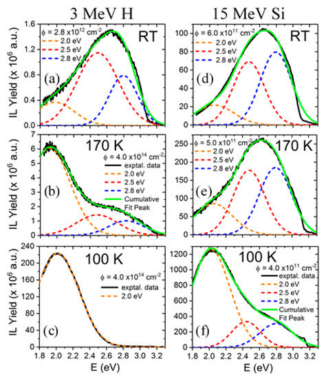 Luminescence emission spectra and Gaussian band components (centered at 2.0, 2.5, and 2.8 eV) of SrTiO3 obtained under irradiation with several high-energy projectile ions and energies at several temperatures (100 K, 170 K and RT, see labels). Irradiation with 3 MeV H (a–c) and 15 MeV Si (d–f) ions have been selected to show the complexity of overlapping emission bands. This figure has been adapted from Crespillo et al. [27].