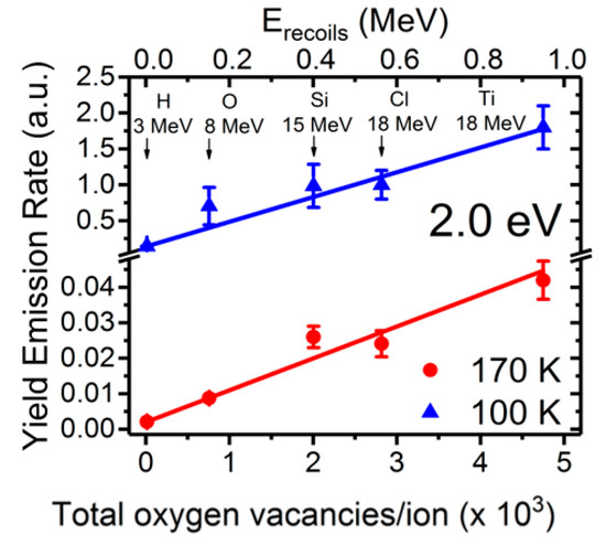 - Crespillo, M.L.; Graham, J.T.; Agulló-López, F.; Zhang, Y.; Weber, W.J. Correlation between Cr3+ Luminescence and Oxygen Vacancy Disorder in Strontium Titanate under MeV Ion Irradiation. J. Phys. Chem. C 2017, 121, 19758–19766. [Google Scholar] [CrossRef]