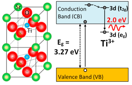 - Crespillo, M.L.; Graham, J.T.; Agulló-López, F.; Zhang, Y.; Weber, W.J. The blue emission at 2.8 eV in strontium titanate: Evidence for a radiative transition of self-trapped excitons from unbound states. Mater. Res. Lett. 2019, 7, 298–303. [Google Scholar] [CrossRef]