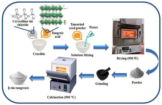 β-SnWO4 nanoparticles were prepared through a rapid microwave heat treatment by the reaction of tin (II) chloride (SnCl2) and tungstic acid (H2WO4) in the presence of tamarind seed powder. A typical procedure involved the addition of 220 mg of SnCl2 and 249 mg of H2WO4 in a clean and dried crucible. In the meantime, 220 mg of tamarind seed powder was also added followed by the addition of 10 mL of distilled water. The obtained blend was stirred for about 10 min. At that time, the crucible was kept in a microwave oven at 900 W for 5 min. The resultant product was taken out of the oven and allowed to cool to room temperature naturally. It was then ground in a clean dried mortar and calcined at 700 °C for 4 h under static air. A schematic of the sample synthesis is presented in Figure 1.