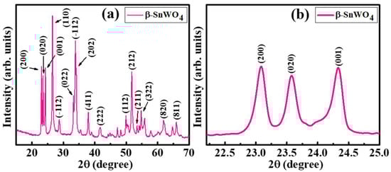 The XRD pattern of the sample was recorded in the 2θ range of 15–70°, as shown in Figure 2a. The existence of intensity peaks corresponding to the (200), (020), (001), (100), (−112), (202), (411), (222), (112), (212), (211), (322), (820) and (811) planes was perfectly matched with JCPDS (Joint Committee on Powder Diffraction Standards) reference no. 01-070-1497 [], a characteristic reference pattern of β-SnWO4. It confirmed the wolframite-type cubic crystal structure of the sample, having space group no. 198 and a space group category of P-213 []. There were no extra peaks signifying the phase purity of the sample []. Further, the magnified image of a few peaks was illustrated to differentiate between these peaks (Figure 2b). The lattice parameter (a) was calculated from following equation: