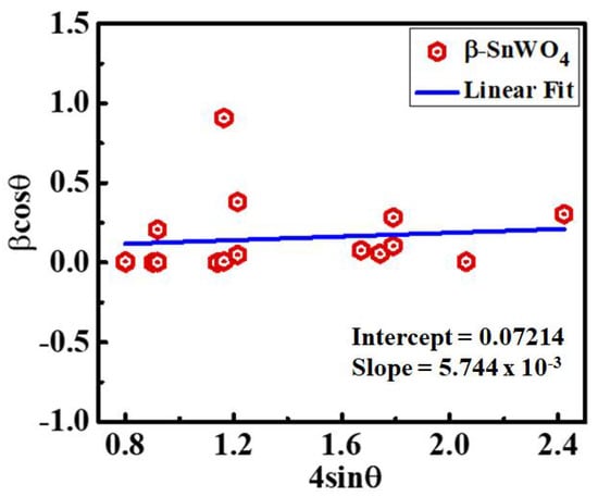 where represented the lattice strain. Figure 3 indicates the W–H plot of β-SnWO4 plotted between 4sinθ at the x-axis and βcosθ along the y-axis. The D was measured from the y-intercept and depicted to be 24.32 nm while measured the slope of the linear fit and was measured to be 7.2 × 10−2. The linear fit of the W–H plot was expected to be a straight line parallel to x-axis but in the manifestation of it gave a non-zero slope []. The measured crystallite size (24.32 nm) from the W–H plot was in close agreement with Scherrer’s formula (28.63 nm).