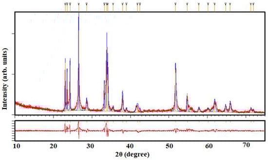Here, P and N represented the number of refined parameters and the number of experimentally observed points and Io and Ic presented the observed and calculated integrated intensities, respectively. Accordingly, wi was the illustrating weight factor at i point of the diffraction profile and the goodness of fit (χ2) was measured using Equation (8), given as []: