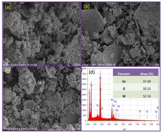 The SEM images for β-SnWO4 are illustrated in Figure 5a–c. The micrographs were obtained at diverse magnifications revealing the formation of β-SnWO4 nanoclusters along with a few sorts of layered and rough structures as well. Stone-like arbitrary and amalgamated particles of various sizes and shapes could be perceived in the micrographs. Figure 5b,c illustrates some rock-like structures along with very small particles. Furthermore, the images also revealed the porosity present in the samples.
