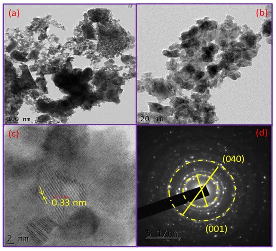 The morphology of β-SnWO4 was also examined using TEM and high resolution transmission electron microscope (HR-TEM) to obtain a detailed breakdown of the structures and to determine the interlayer d-spacing. Figure 6a,b illustrates the TEM images obtained at different magnifications. The micrographs profiled almost spherical shaped particles accompanied by some amalgamation. Further, a few pores could also be professed in the micrographs. The interlayer d-spacing was examined through HR-TEM and found to be 0.33 nm [] and can be seen in Figure 6c. The lattice fringes of the (001) lattice plane of a wolframite-type cubic crystal structure β-SnWO4 could be perceived (Figure 5d) as sketched by a selected area electron diffraction (SEAD) pattern. The occurrences of bright rings in the concerning pattern illustrated the company of highly crystallite particles. The existence of the lattice plane was in good agreement with the XRD pattern.