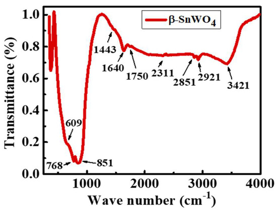 The FTIR spectrum for β-SnWO4 was recorded in the range of 350–4000 cm−1, as shown in Figure 7. The peak appearing around 609 cm–1 demonstrated an asymmetric stretching vibration of the W group [,]. In the same way, the peaks emerging at 768 and 851 cm−1 illuminated the stretching vibrations of the W–W and W–O–W bridging bonds []. The structural vibrations of the C–C or C–O–C bonds were in agreement with the peak occurring at 1443 cm−1. Further, the existence of a strong peak at 1640 cm−1 and a broad peak at 3421 corresponded with the stretching and bending vibrations of the hydroxyl (–OH) group. The symmetric stretching vibration of the C–H bond could be observed from the peak befalling at 2921 cm−1. The co-existence of all of the stretching and vibrational peaks confirmed the formation of the β-SnWO4 structure [].