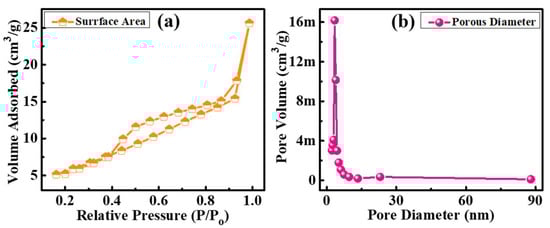 A Barrett–Joyner–Halenda (BJH) analysis was carried out to investigate the N2 adsorption-desorption isotherm as well as to determine the pore size distribution. The curve sketched in Figure 8a clearly offered a desorption hysteresis of a type-IV isotherm curve [,] obtained under a relative pressure (P/Po) of 0.1–1.0. The characteristics of the mesostructured materials could be well explained on the basis of sharp capillary condensation steps occurring between the relative pressure intervals of 0.40–0.95. It also perceived an irregularity of mesopores in the product. The BJH pore size distribution is profiled in Figure 8b. A sharp peak could be depicted in the beginning of the distribution curve demonstrating an average pore diameter of 3.35 nm. The pore volume and surface area of the particles in the sample were determined using a Brunauer–Emmett–Teller (BET) analysis. Accordingly, due to its plentiful range of pore diameters (2–80 nm), it could accumulate a higher number of charge carriers thus improving the electrolyte performance of the current specimen. Hence, it can offer its utilization in a wide collection of potential applications.