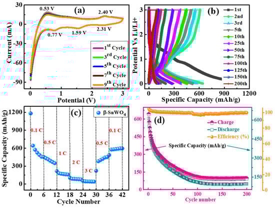 CV measurements were implemented to analyze the ongoing electrode reactions throughout the charge/discharge for the β-SnWO4 nanostructures. The CV profile was mapped under various current cycles and a potential window of 0.01 to 3.0 V and is demonstrated in Figure 9a. The composition clearly described the actuality of the anodic/cathodic peaks. Similar current humps could be perceived from all of the current cycles. During lithiation, three peaks could be depicted specifying a multi-lithiation progression []. The reduction of β-SnWO4 to Sn and W was noticed from the first reduction peak and appeared around 2.31 V as prescribed in Equation (9). Another reduction peak occurred at 1.59 V justifying the Sn-metal reaction in the excess vicinity of the Li+ ions (alloying reaction) []. The following reaction could be perceived in Equation (10). In addition, the W-metal reaction with LiSn and excessive Li+ ions could be observed in Equation (11) that resulted from the existence of a third reduction peak at around 0.77 V. The reverse of the reduction known as oxidation also occurred. The anodic peak that appeared around 0.53 V was attributed to the de-alloying of LixSn while the peak that appeared at 2.40 V identified the oxidation of Sn and W to β-SnWO4. The probable electrochemical reactions were as follows []: