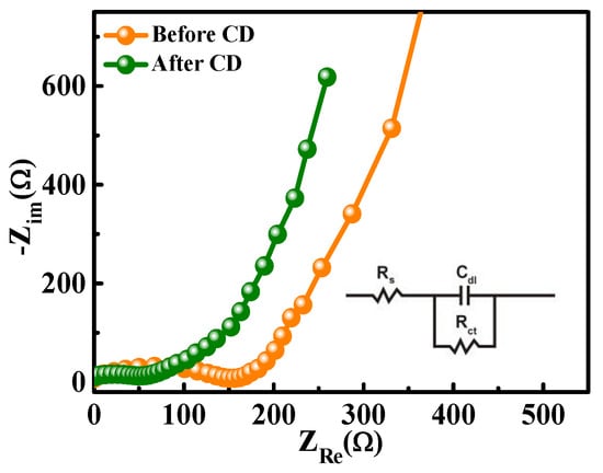 The kinetic behaviors specifying the charge transfer properties of the as-synthesized electrodes were examined by means of a powerful electrochemical impedance spectroscopy (EIS) tool. The EIS measurements were obtained before and after CD cycles and a Nyquist plot was sketched (illustrated in Figure 10) using a Randles circuit model (inset Figure 10). The outcome of the graph was a slope line in the low frequency region signifying an electron diffusion process and a semicircle arc in the high frequency region attributing the charge transfer resistance (Rct) []. The Rct could be indicated from the radius of the semicircle at the electrolyte/electrode interface. The formation of semicircles of two different diameters indicated different Rct values. The Rct value for β-SnWO4 after CD was much lower (108 Ω) than that of before CD (163 Ω) characterizing the presence of negative charges on the β-SnWO4 surface. It thus hosted an electrostatic repulsion between the electrolyte/electrode boundaries leading to a low rate charge transfer [].