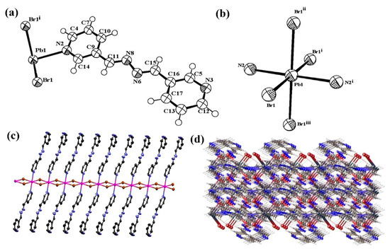 Table 1 and Table 2 show the results of single-crystal XRD for the structure of compound I. According to the single-crystal XRD in Figure 2, the structure of [Pb(L)Br2]n crystallized in a monoclinic system with the space group of P21/c resembled that of solid 1D fishbone metal–organic coordination polymers. Figure 2a shows the structure of the asymmetrical unit of 1 and an atom numbering arrangement selected. A Pb atom is coordinated by two N atoms of the L ligand with the same Pb–N distance of 2.670 Å and four bridged bromine anions with a Pb–Br distance of 2.992 (2.972, 2.992 and 2.972 Å). Figure 2b shows a coordination number of six for lead(II) atom in two modes with a PbN2Br4 donor set. The adjusted Pb····Pb distances belonging to the chain were 4.001 Å. This order demonstrates a symmetry in the coordination geometry surrounding metal ions in a holodirected fashion. Given the labile interactions, the architecture of one-dimensional chains was allowed to interact with neighboring chains, and the structure was also allowed to be extended into three-dimensional supramolecular metal-organic coordination polymers, as shown in Figure 2d.