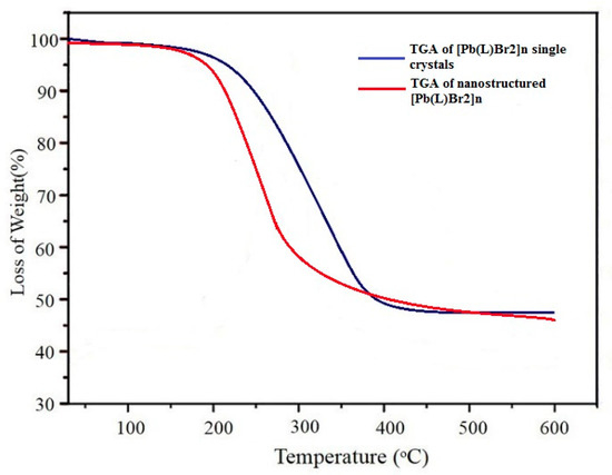 TGA plot of [Pb(L)Br2]n (1) in single crystal shape and nanostructured mode.