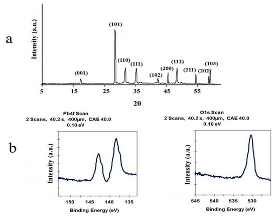 (a) XRD pattern and (b) XPS spectra of PbO nanoparticles prepared by thermolysis of compound 1.