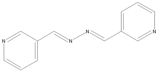 A mixture of 5 mmol (0.45 mL, 0.45 g) of hydrazine hydrate (35 wt.% in water) and a solution of 10 mmol (1.07 g) of nicotinaldehyde in 100 mL of methanol was refluxed for one day. Afterwards, the obtained yellow solids were filtered and then rinsed in methanol and dried in a vacuum (yield: 65%, 0.98 g), m.p. 140 °C, FTIR (KBr) = νmax (698, 706, 817, 863, 1021, 1089, 1185, 1225, 1304, 1417, 1482, 1586, 1625, 2929) Cm−1. H NMR (CDCl3, ppm): 8.66 (s, 2H), 8.70 (d, 2H), 8.97 (s, 2H), 7.41 (d, 2H), 8.22 (d, 2H).
