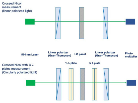 When an almost uniformly stacked smectic liquid crystal molecule is obtained, the SSD-LC panel shows in-plane-only retardation switching. Although intrinsic in-plane/out-of-plane retardation switching behavior is measurable by using a pair of photo-elastic modules [22], there is a simpler optical measurement, made by observing a comparison between a linearly polarized incident beam and a circularly polarized incident beam, which enables separation between in-plane-only, or a mixture between in-plane and out-of-plane, retardation switching. This measurement set-up is shown in Figure 2.