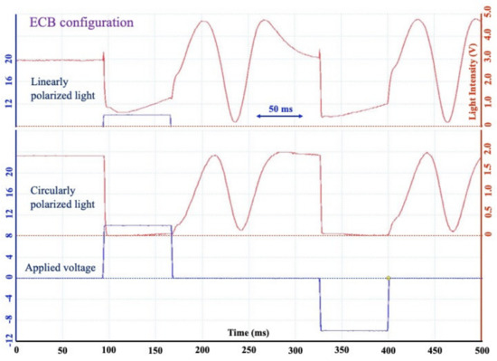 As shown in the Figure 3 upper viewgraph, an ECB-LC panel shows immediate light intensity reduction by an applied pulse voltage to the linearly polarized incident beam. The lower viewgraph in Figure 3 for a circularly polarized incident beam shows similar light-throughput behavior to the upper viewgraph. However, during pulse voltage application, a linearly polarized case shows some increase in light throughput, while a circularly polarized case shows it as almost flat. This dynamic light-throughput behavior suggests some in-plane and out-of-plane retardation switching behavior. In the ECB-LC panel, the initial planar aligned liquid crystal molecules change their directors to perpendicular to the substrates. This director change is very quick, as seen in the lower viewgraph of Figure 3. Once turned, some liquid crystal directors perpendicular to the substrates seem to rearrange each other, keeping their directors mostly perpendicular to the substrates. Such behavior leads to total retardation change during the pulse voltage application. Even total retardation shows some increase in its light intensity. Light intensity to a circularly polarized incident beam shows almost no change. The reasonable interpretation of these light intensity changes, shown in Figure 3, is that once turned, liquid crystal molecular directors perpendicular to the substrates remain perpendicular; however, they rearrange the directors in the plane perpendicular to the substrates. Even the director movement would be small; such a director rearrangement move gives some small retardation change, as shown in the upper viewgraph in Figure 3. After removing the applied pulse voltage, the opposite director movement occurs. Right after removing the applied voltage, most of the liquid crystal molecular directors turn parallel to the substrates; however, there is not a singular path from perpendicular to parallel, but many. After the director turns parallel to the substrates, each director starts to rearrange to the initial alignment. This process is within the same plane, or in-plane retardation only. The different light intensity dynamics after the removal of the applied pulse voltage between linearly and circularly polarized incident beams clearly suggests such dynamic behavior.
