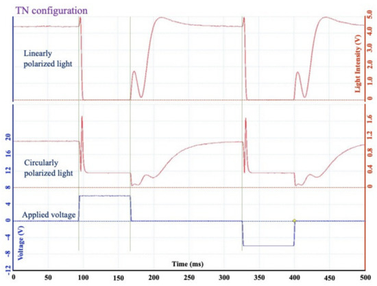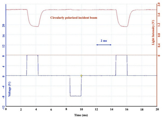 The SSD-LC panel gives a fast optical response for a linearly polarized incident beam, such as around 200 μs on and off response times, respectively, as shown in Figure 5. Applying the same drive voltage, a circularly polarized incident beam does not show any significant amplitude change, as shown in Figure 6.