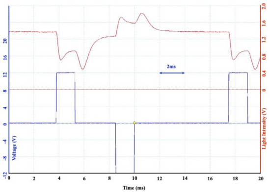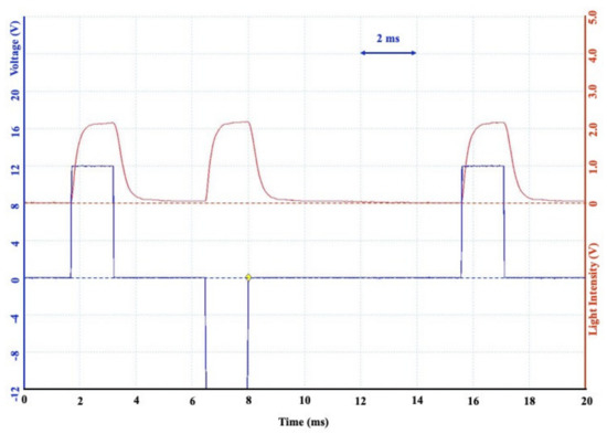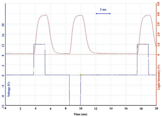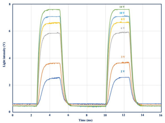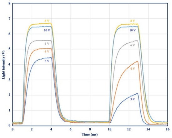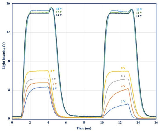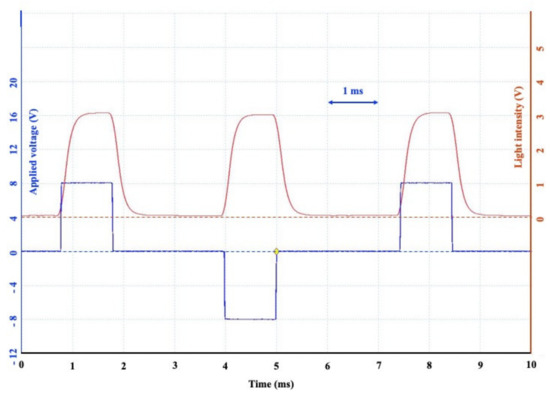 This SSD-LC panel shows an almost symmetric optical throughput both for a positive pulse and a negative pulse. The first peaks in Figure 7 correspond to positive a 3 ms duration pulse, and the second peaks correspond to a negative pulse. As shown in Figure 7, the SSD-LC panel has an almost symmetric optical response to a bipolar pulse voltage drive, as well as almost constant optical response times, regardless of the variation in pulse voltage. This applied voltage-insensitive response time is also one of the unique features of an SSD-LC panel [1,2].