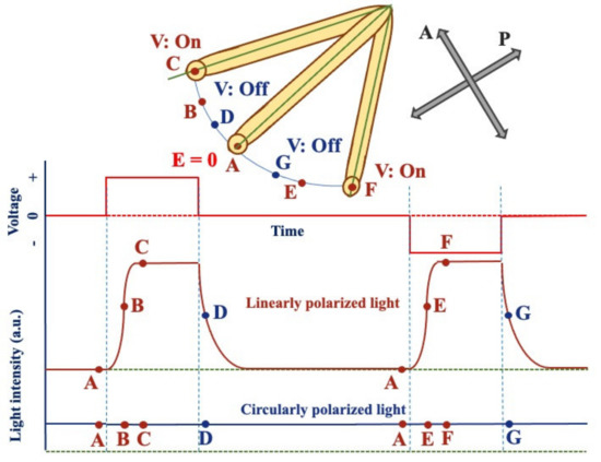 Figure 16 illustrates the expected SSD-LC molecular director switching behavior of the slightly twisted SSD-LC panel. In the slightly twisted stacked case, the SSD-LC molecule lifts slightly, as illustrated in Figure 16, from the initial position A to position B, position C, and then reaches position D. Both positions B and C are out-of-plane from the initial aligned plane. The final position D is located in the same plane as position A. When the applied positive pulse voltage is removed, the SSD-LC molecule swings back from position D to position A through the positions E and F. Although positions B, C and positions E, F are out-of-plane from the initial aligned plane, the swing path from position A to position D, and position D to position A are the same path. When a negative pulse voltage is applied and removed, the SSD-LC molecular swing path is the same as the one with a positive pulse voltage application case, but the opposite direction from the positive pulse application case, as illustrated in Figure 16.