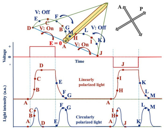 Unlike in Figure 9, Figure 12 shows asymmetric out-of-plane retardation switching. In this expectedly heavily twisted stacked SSD-LC panel, the applied pulse voltage dependence of light for the linearly polarized incident beam is shown in Figure 13.