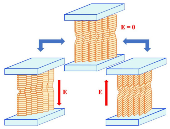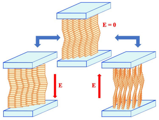 An ideal configuration of the SSD-LC drive mode is illustrated in Figure 1. A tilted smectic liquid crystal molecule, such as SmC, SmH, and SmI sub-phased liquid crystal molecule as a bulk state, is stacked uniformly in parallel to the substrates, as shown in Figure 1. Due to strong azimuthal anchoring, tilted smectic liquid crystal molecules align parallel to the surface initial alignment direction, such as the mechanical buffing direction. Under the crossed Nicol optical setup, as a normally black configuration, the SSD-LC panel shows light throughput depending on the applied electric field strength. The SSD-LC molecules swing in the same, originally aligned plane, and the swing angle is dependent on the applied electric field strength. Whether the swing direction is clockwise or counter-clockwise is dependent on the applied electric field direction, such as upward or downward, at the SSD-LC panel.