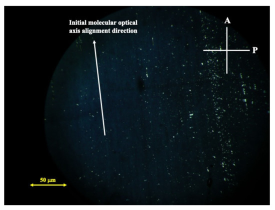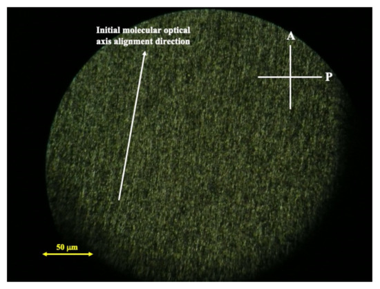 The expectedly slightly twisted configured SSD-LC panel’s texture photo is shown in Scheme 2. Even a comparison between Figure 8 and Figure 9 suggests some significant retardation switching behavior difference, with the uniformly stacked SSD-LC panel shown in Figure 5 and Figure 6. The two panels’ textures are not so different, as shown in Scheme 2. It is assumed that, unlike spontaneous polarization-based smectic liquid crystal panel cases such as SSFLCDs, DeVries types, non-spontaneous polarization SSD-LC panels’ texture under a crossed Nicols condition is much more similar to those for uniaxially aligned nematic liquid crystal panels.