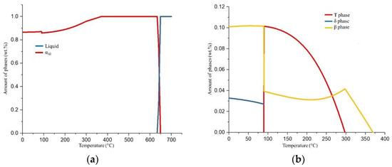 The solidification sequence of Al-2.18Mg-1.92Li alloy under equilibrium conditions is shown in Figure 2a,b, while the following invariant reactions and corresponding temperatures are given in Table 2.