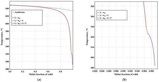 The non-equilibrium solidification sequence of Al-2.18Mg-1.92Li alloy based on the classic Scheil–Gulliver model: (a) the curve covering complete solidification and (b) the segment of the curve emphasizing the phase solidification.
