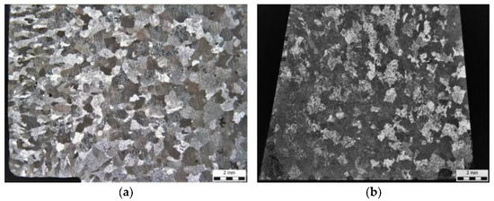 The macrostructure of the sample in as-cast condition has a heterogeneous grain morphology consisting of chill, columnar, and equiaxed zones. The narrow chill zone formed at the surface of the sample is followed by the zone of columnar grains. The zone of equiaxed grains is in the center of the sample (Figure 4a). The solution hardening led to homogenization in the grain morphology (Figure 4b).