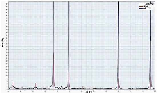 The equilibrium solidification sequence begins with the transformation of the αAl dendritic network at 640 °C (Figure 2a) containing 96.59 wt.% Al, 1.66 wt.% Mg, and 1.75 wt.% Li (Table 2). The rest of the equilibrium solidification sequence is based on the solid-state diffusion processes in the αAl dendritic network (Figure 2b). The stable δ phase precipitates at 360 °C containing 78.44 wt.% Al, 4.77 wt.% Mg, and 16.79 wt.% Li (Table 2). The amount of precipitated δ phase grows until 290 °C when the T phase begins to precipitate (Figure 2b) containing 71.53 wt.% Al, 17.02 wt.% Mg, and 11.46 wt.% Li (Table 2). The solidification sequence ends with the precipitation of the β phase containing 49.95 wt.% Al, 44.73 wt.% Mg, and 5.31 wt.% Li at 89.15 °C (Table 2). The precipitation of the β phase suppresses the T phase’s precipitation and increases the precipitation of the δ phase (Figure 2b) and the αAl dendritic network (Figure 2a).