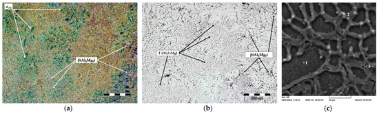 The microstructure of the sample in the as-cast condition consists of the αAl dendritic network (Figure 6a) and precipitates located between the branches of αAl dendrites (Figure 6a). The precipitates located between differently oriented αAl dendrites have coarse morphology corresponding to the secondary eutectic β phase (Figure 6b). The precipitates located between the secondary branches of αAl dendrites have finer morphology and can be identified as T phase (Figure 6b). The αAl dendrites consist of 98.08 wt.% Al and 1.92 wt.% Mg (Figure 6, Table 4, detail 1). The reduced solid solubility of Mg in αAl matrix with respect to temperature resulted in Mg segregation to interdendritic areas (Figure 6, Table 4, detail 2). Consequently, the Mg content in interdendritic areas increased to 3.37 wt.% Mg. The highest Mg content of 4.49 wt.% is connected to the secondary eutectic β phase (Figure 6, Table 4, detail 3).