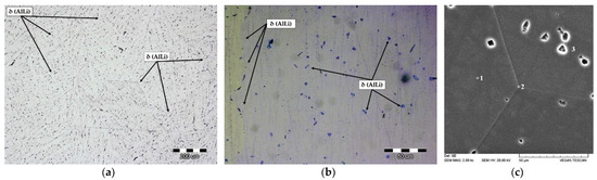 The microstructure of the sample in solution-hardened condition: (a) etched with Keller’s etching solution; (b) etched with Weck’s etching solution; (c) SEI with indicated details for EDS analysis.