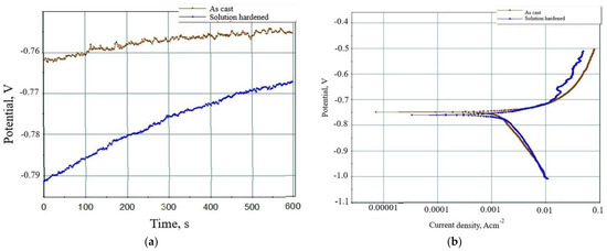 The negative corrosion potential (Ecorr) recorded during Time dependence of open circuit potential measurements indicates instability of samples and their dissolution during testing (Figure 8a and Table 6). The sample in as-cast condition shows less negative potential (−755 mV) compared to the solution-hardened sample (−767 mV), indicating higher resistance to microstructure degradation (Table 6). However, an increase in the corrosion potential of the solution-hardened sample during the Time dependence of open circuit potential measurements points to spontaneous passivation (Figure 8a). The Tafel polarization curves ratify the higher stability of the sample in as-cast condition compared to the solution-hardened sample (Figure 8b). The extrapolation of obtained Tafel polarization curves indicates more negative corrosion potential (−752.52 mV), higher current density (4.61·103 µA.cm2), anode slope (174.76 mV/dec), cathode slope (742.96 mV/dec), and corrosion rate (51.24 mm/year) for the solution hardened sample. The higher current density and anode slope are consequences of the dealloying and dissolution of Al (Table 6). The higher cathode slope is attributed to the solution reduction and local increase in pH value. The local increase in the pH value of the testing solution led to the spontaneous passivation of the solution-hardened sample and an increase in corrosion potential (Figure 8a and Table 6).