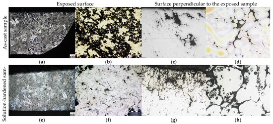 The macrostructure of the sample in as-cast and solution-hardened conditions is given in Figure 4.
