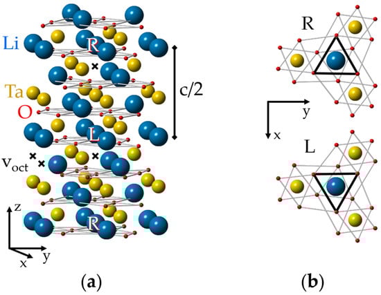 (a) Ideal lattice of lithium tantalite (LT). To simplify the representation of the lattice and defect structures in it, the sizes of “balls” imitating ions were made intentionally different. The L (Left) and R (Right) positions are distinguished by their different oxygen surroundings. (b) An illustration of local C3 symmetry for the nearest surroundings of cation sites and glide mirror zy plane that transforms the L center to the R partner; a projection of one Li, Ta layer between two oxygen layers on the xy plane is shown.