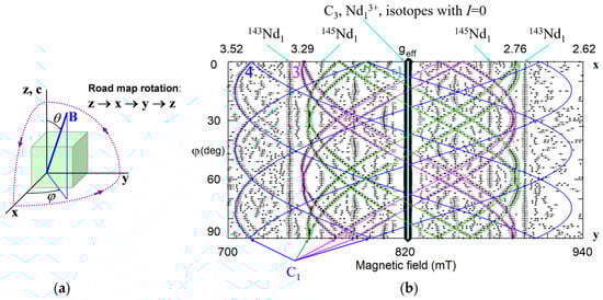 (a) The road map rotation corresponds to the following changes of the θ, ϕ angles: θ = 0–90° at ϕ = 0°; θ = 90°, ϕ = 0−90°; θ = 0−90° at ϕ = 90°. (b) Angular dependence of the EPR spectra in xy plane for nearly stoichiometric LN:Nd3+. Rhombs represent experimental line positions for Q-band measurements (ν = 34.445 GHz), their sizes reflect line intensities. Horizontal whiskers near rhombs represent line widths. Cyan, lime, fuchsia, and blue curves represent simulated dependencies for axial Nd1, and low-symmetry Nd2, Nd3, and Nd4 centers, respectively. Curves for isotopes with nuclear spin I ≠ 0 are not shown.