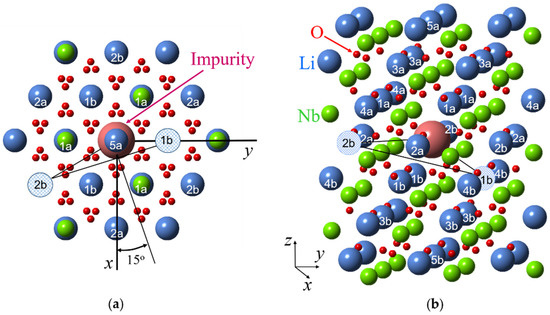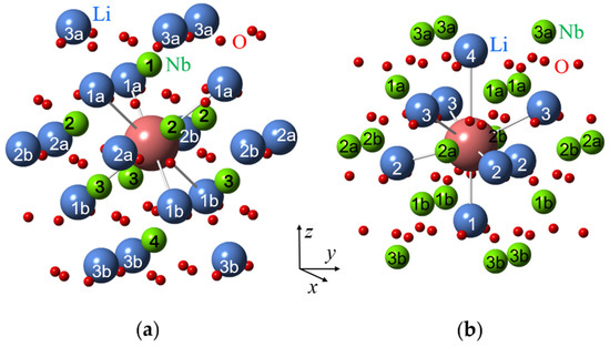 Surroundings of impurity ions substituted for Li (a) and Nb (b) in LN crystal lattice with corresponding shell numbers. Large blue balls represent Li+ ions, medium green balls—Nb5+ ions, small red balls—O2− ions, and the largest magenta ball—the impurity ion.