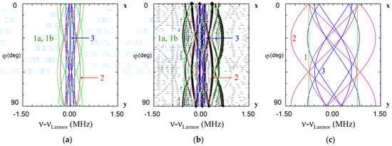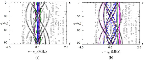 Angular dependence of electron nuclear double resistance (ENDOR) frequencies of Li nuclei in xy plane for the Nd13+ center in LiNbO3. The green, red and blue curves—calculated frequencies for Li nuclei of the 1st, 2nd and 3rd shells based on dipole-dipole interaction for Nd3+Li (a,b), and Nd3+Nb (c). ENDOR frequencies represented on the part (b) were measured at magnetic fields corresponding to the position of dominant EPR line #1 on Figure 2 (B = 820 mT for ν = 34.445 GHz, rhombs, and B = 228 mT for ν = 9.500 GHz, triangles). νLarmor is Larmor frequency of 7Li nuclei.
