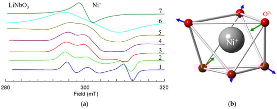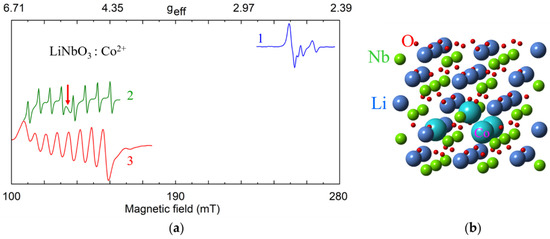 All lattice images were generated using CrystalMaker® program [82] and crystallographic data [83,84,85,86]. Sizes of oxygen balls were artificially reduced, since nonmagnetic O2− ions are invisible for EPR/ENDOR. As LiNbO3 and LiTaO3 are isostructural crystals, all figures with lattice and structures of impurity centers are equally applicable to both LN and LT. However, dipole-dipole interactions should be calculated taking into account a difference of their lattice constants.