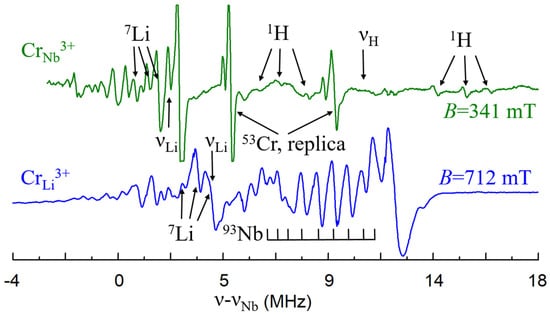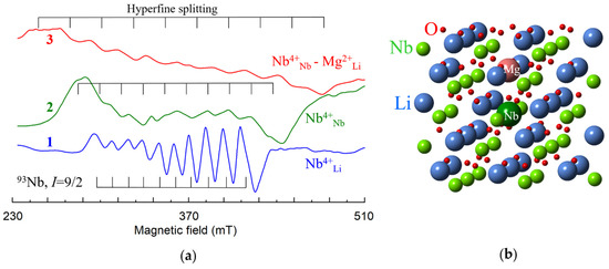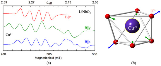 - Malovichko, G.; Bratus, V.; Grachev, V.; Kokanyan, E. Electron paramagnetic resonance and electron-nuclear double resonance study of nonequivalent Yb3+ centers in congruent and nearly stoichiometric lithium niobate. Phys. Status Solidi (b) 2009, 246, 215–225. [Google Scholar] [CrossRef]