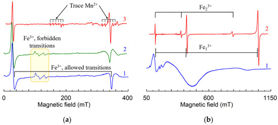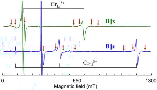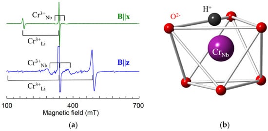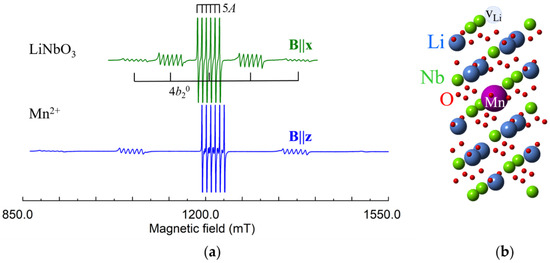 - Yeom, T.H.; Chang, Y.M.; Choh, S.H.; Rudowicz, C. Experimental and Theoretical Investigation of Spin-Hamiltonian Parameters for the Low Symmetry Fe3+ Centre in LiNbO3. Phys. Status Solidi (b) 1994, 185, 409–415. [Google Scholar] [CrossRef]