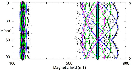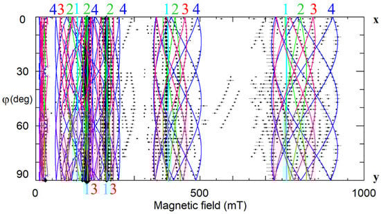 To make correct labeling of all observed lines a detailed study of angular dependence of EPR line positions is required. For instance, we can rotate magnetic field in xy crystallographic plane, changing azimuthal angle φ between x-axis and B. Circular diagram of measured spectra (Figure 3) show that dominant line draw a circle, i.e., has no dependence of Bres(1) on φ. Angular patterns of other lines demonstrate the presence of all elements of the 3m group, namely, C3 symmetry and the mirror with respect to y-axis at φ = 90 deg. Measurement of such a diagram is redundant, since xy plane angular patterns simply repeat themselves with a period 60 deg. Due to the glide mirror plane, the 30 degree dependence measured from x axis contains all information.